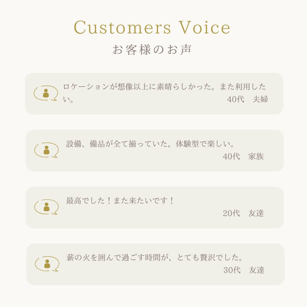 | 設備 | バスルーム、洗浄機付トイレ、キッチン(IHクッキングヒーター、冷蔵庫、電子レンジ、炊飯器、湯沸かし器、トースター)、エアコン(リビング)、洗濯機、乾燥機、音楽スピーカー、wi-fi、扇風機(夏季)、灯油ストーブ(冬季)、 薪を使ったアウトドア設備(BBQ、たき火、テントサウナ、露天風呂) |